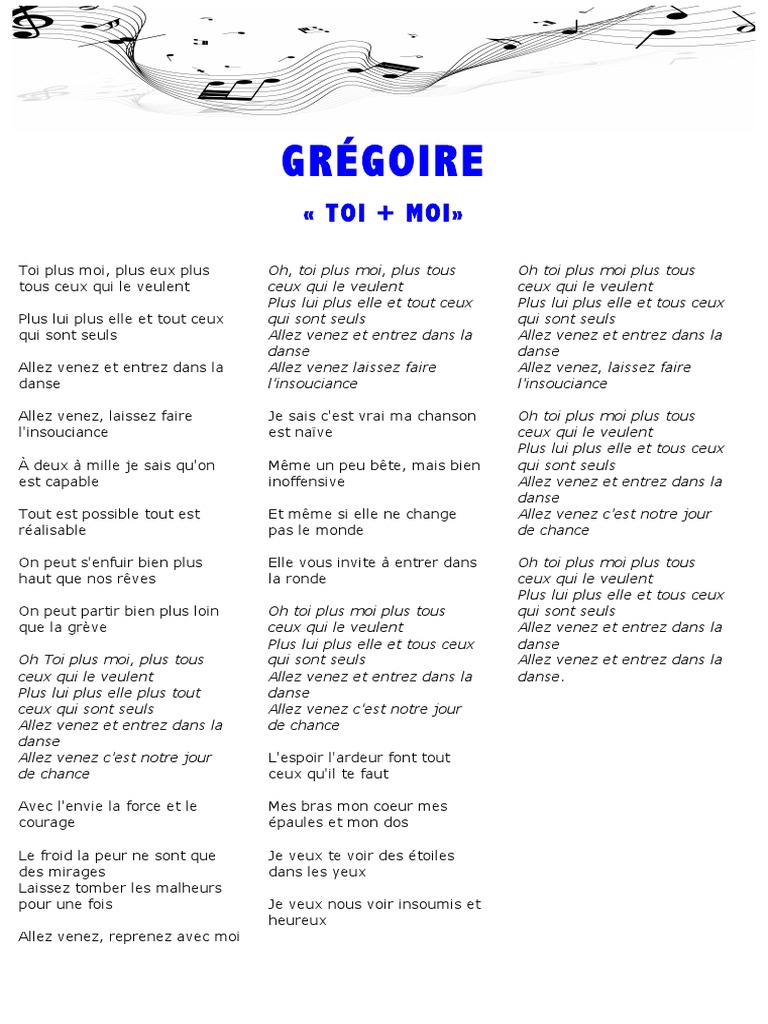 Gregoire Toi Moi Paroles Et Musique Gregoire Mymajorcompany Themes Objectifs Vocabulaire Notes Liste Des Activites Pdf Free Download